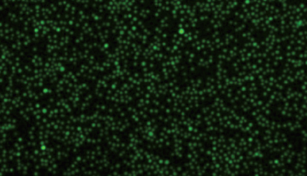 Fluorescence microscopy image showing green fluorescent protein expression in sonoporated human B cells.