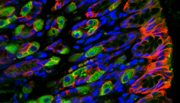 Immunofluorescence image of human stomach section stained for a gene involved in regulating cellular adhesion ARHGAP26 (green), epithelial cadherin (red) and cell nuclei (blue).