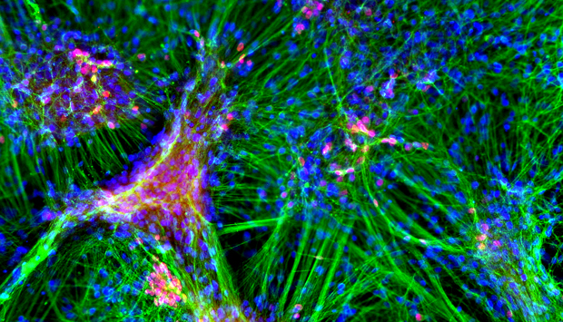 The collaborative effects of the lncRNA RMST and the protein SOX2 help drive maturation of neurons, labeled here by expression of fluorescent neuron-specific proteins.