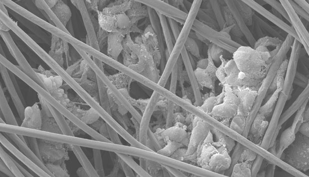 Glioblastoma cells growing along the fibers of the 3D scaffold.