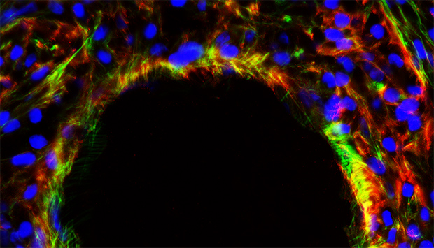 Microscopic image of cardiomyocytes surrounding a microcarrier. Cardiac proteins stained red (troponin) and green (actin); cell nuclei stained blue.