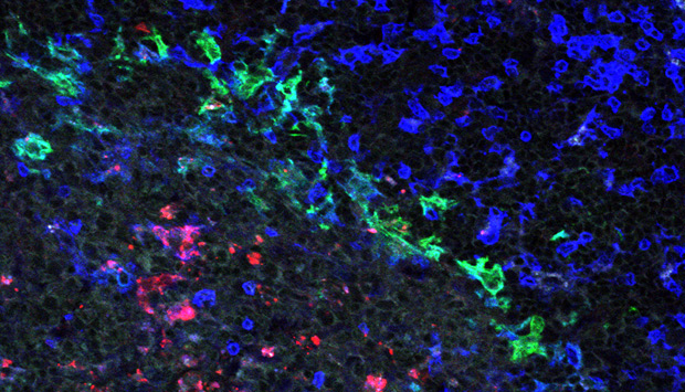 Fluorescence microscopy image of a spleen from a dengue virus-infected mouse with infected cells labeled red, macrophages labeled green and T cells labeled blue.